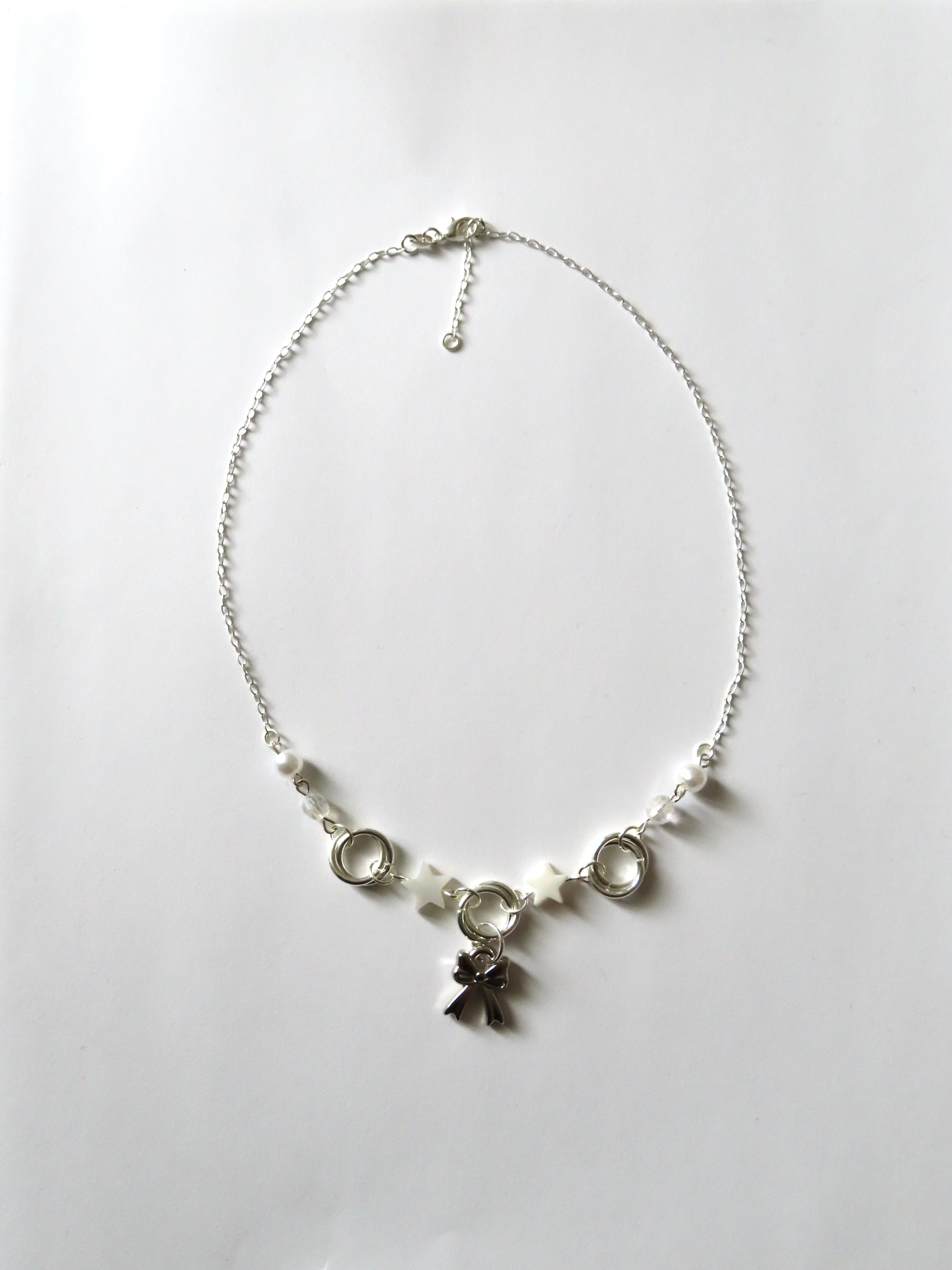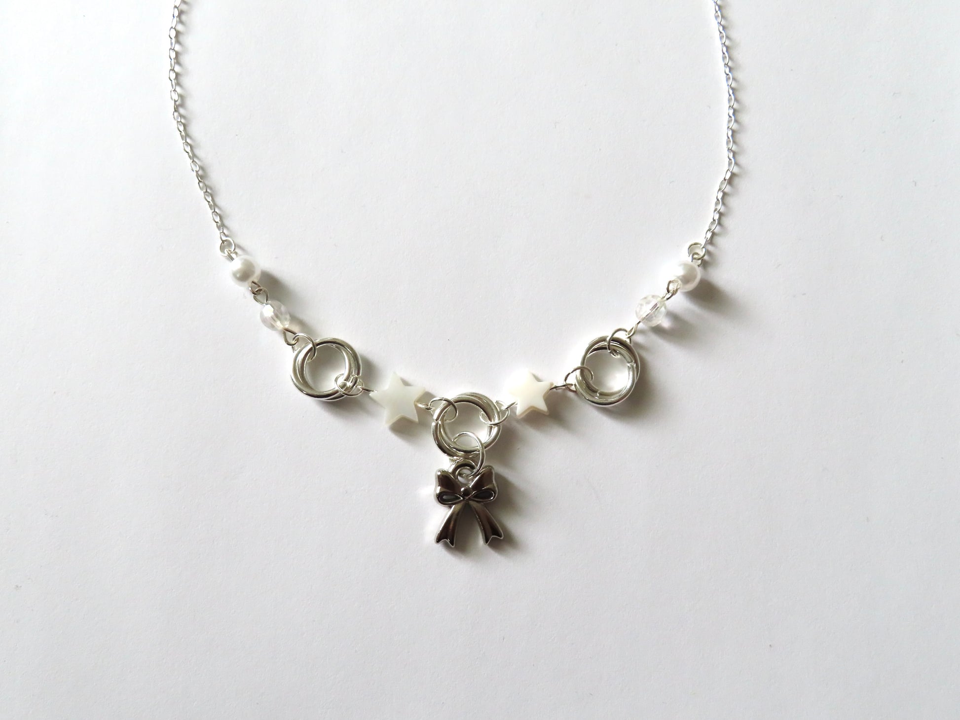 made with stainless steel chain, freshwater pearl star beads, faux pearl beads, iridescent beads, and a bow charm